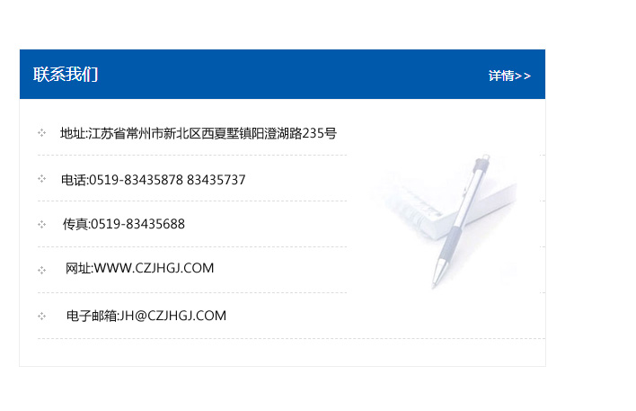 傳真:0519-83435688    郵編:213135    網址:WWW.czjhgj_com.zjgzsj.com    電子郵箱:JH@czjhgj_com.zjgzsj.com